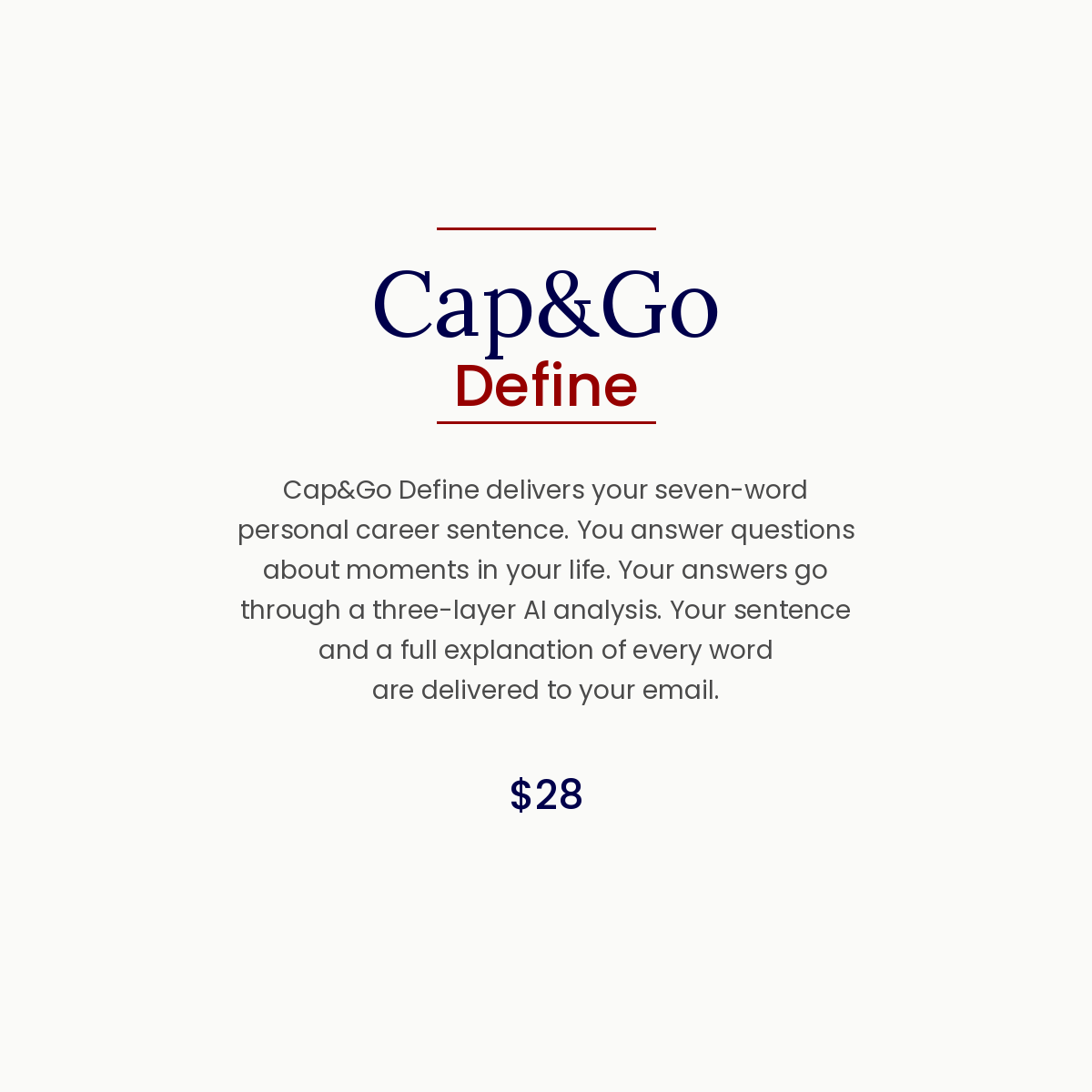 Cap&Go Define delivers your seven-word personal career sentence. You answer questions about moments in your life. Your answers go through a three-layer AI analysis. Your sentence and a full explanation of every word are delivered to your email. The sentence is your lifelong guide for choices and opportunities.